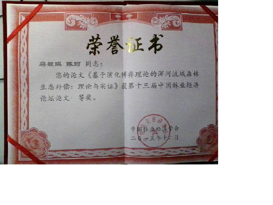 2015年12月26-27日,在东北林业大学举办了第十三届中国林业经济论坛,我院派出何丹、朴慧兰两位老师及蒋毓琪、陈同峰两位博士生参加了为期两天的论坛,与全国林业经济的同行专家交流学术思想,启迪研究思路。蒋毓琪博士在论坛上做了题为“基于演化博弈理论的浑河流域森林生态补偿:理论与实证”报告(作者:蒋毓琪、陈珂),这篇论文在学术论坛论文评选中得到了专家们的一致认同,获得了论文一等奖,这也是我院在林业经济论坛学术论文评比中获得的最高奖项。